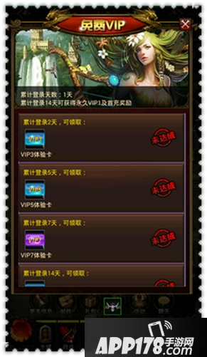 首日登录赠送VIP1体验卡(12小时),次日登陆赠送VIP3体验卡,更有VIP5、VIP7体验卡免费赠送,累计登录14天将获得VIP1永久卡。