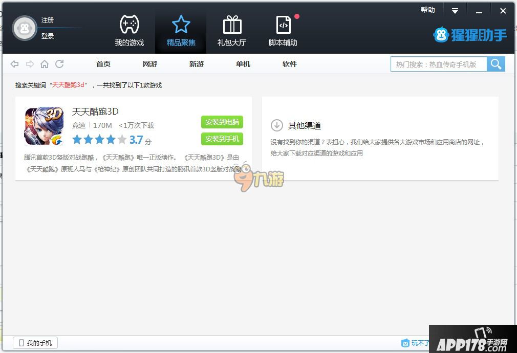 下载猩猩助手手游模拟器最新版本,双击安装辅助。第一次打开需要下载模拟器,仅此一次,若杀毒软件阻止,请允许通过(切记,这一步非常重要如果不允许,后续的apk包无法正常安装,会显示安装失败。)安装完成后打开猩猩助手,进入精品聚焦页面,在搜索栏中搜索“天天酷跑3d”,就会出现这款游戏的最新电脑版程序安装包。点击安装进行下载,下载完毕后就会自动安装,首次安装需下载游戏以及相关的运行环境,时间可能会比较长,请耐心等待。