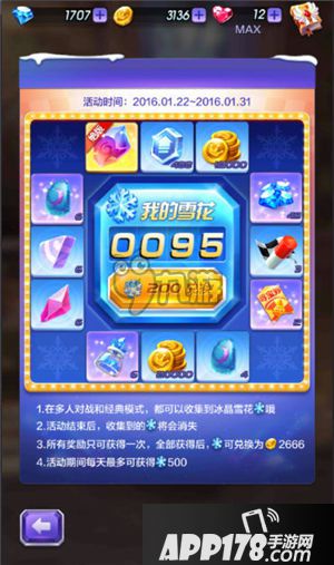 根据冰雪节活动规则我们知道,在多人对战和经典模式可以收集到雪花,一定雪花可以兑换奖品,12个奖品每个只能兑换一次,从1月22日到1月31日每天最多可获得500个雪花。12个奖品中就有绝版的天虹之彩!这在特工papa看来,只要每天坚持收集雪花,在活动期间内获得天彩之虹并不是什么难事。