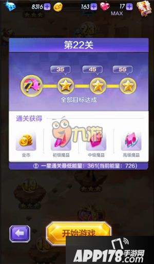 22关卡位于巨神遗迹,本关卡的最低能量要求是361,过关要求是跳过障碍物,一星过关需要跳过35个障碍物,二星需要45个,三星需要55个!三星通关除了玩家需要有足够的能量外,技巧也不可少。