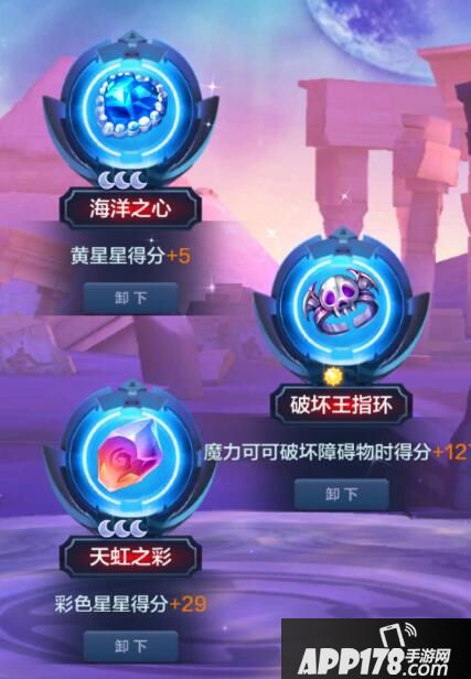 海洋之星(黄星星得分+5)+破坏王指环(魔力可可破坏障碍物时得分+127)+天虹之彩(彩色星星得分+29),注意:这里的分数加成都是小虎升级宝物后的分数。