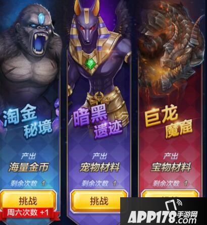 秘境分为:淘金,暗黑和巨龙,对应的产出为金币,宠物材料,宝物材料。
