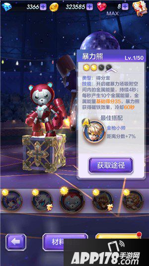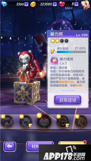 技能:开启辞暴力场吸附空间内的金属能量,持续4秒;每秒产生10个金属能量,金属能量基础得分35分,暴力熊获得磁铁效果,冷却60秒。