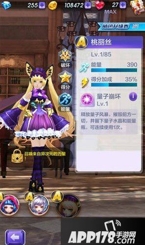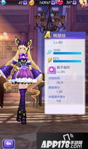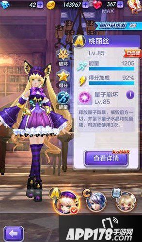 首先,来看一下桃丽丝的各项属性,不难发现,桃丽丝和其他角色的主要差别就在于等级上限上。作为游戏中唯一一个等级最高可以达到85级的角色,桃丽丝的各项属性都有所提升,相比较魔女娜娜与魔力可可,满级状态下能量上限高出100多点,加分高出15%左右。不要小看这些数据,如果是在经典模式下,多出来的能量和比较高的加成分数可以让桃丽丝角色获得更高的分数哦。