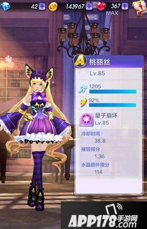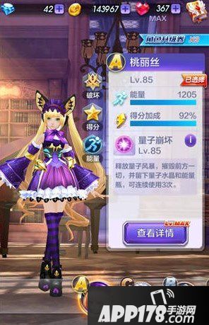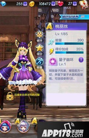 首先,来看一下桃丽丝的各项属性,不难发现,桃丽丝和其他角色的主要差别就在于等级上限上。作为游戏中唯一一个等级最高可以达到85级的角色,桃丽丝的各项属性都有所提升,相比较魔女娜娜与魔力可可,满级状态下能量上限高出100多点,加分高出15%左右。不要小看这些数据,如果是在经典模式下,多出来的能量和比较高的加成分数可以让桃丽丝角色获得更高的分数哦。