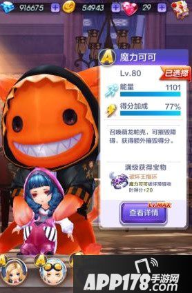 魔力可可能量是1101,得分加成方面是77%。可以召唤萌龙帕克,技能持续时间内可摧毁前方障碍,获得额外摧毁得分。魔力可可满级之后可以获得宝物破坏王指环,这个指环可是相当棒的哦。