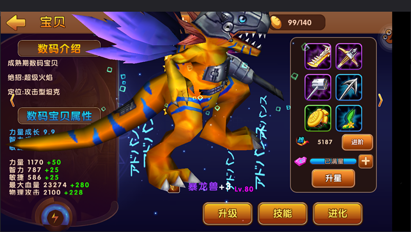 每一个数码宝贝都可以通过收集灵魂石来解锁和进化,每一次进化之后相对应的战斗属性也会得到极大的提升。决定数码宝贝战斗力的还有各自的装备属性,给力的装备也是宝贝养成的一条重要途径。结合以上两点最终打造出最强的专属“梦之队”。