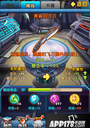 精炼装备则是可以提升装备附带的基础属性外,还能额外提升特殊属性(比如武器的暴击率),每级精炼都能为装备提升大量属性。精炼过程中,需要消耗精炼石来填充每级升级所需的精炼经验槽。精炼石主要获取途径为试炼塔装备商店兑换,每天各品质的精炼石兑换次数有限制,所以玩家们在精炼装备的时候及时每天兑换便可以最快速的将战斗力推至最大化。装备精炼也可以增加强化大师的装备精炼大师等级,同样的伴随着相当可观的属性提升!