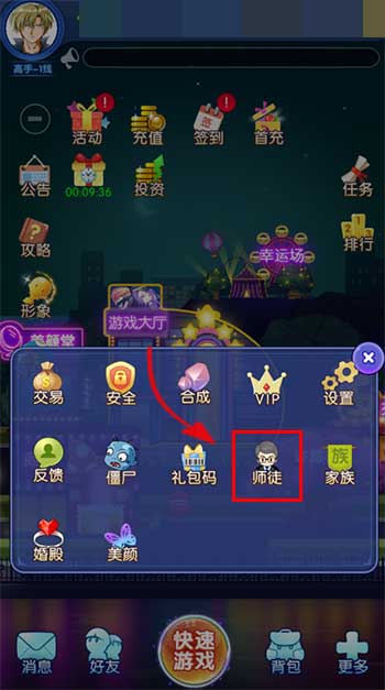 在“游戏大厅”中,手机端点击“更多”、电脑端从人物左侧边栏中可找到“师徒”并进入。