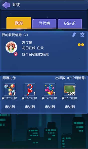 当收徒信息成功发布之后,就能在“我的”里面看到自己的收徒信息啦~快期待着能有个美丽的徒儿和自己一起去杀手城冒险吧!