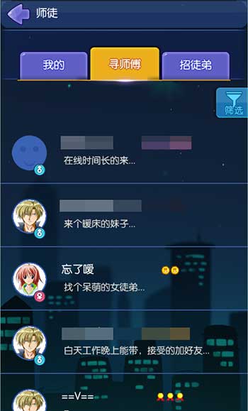当筛选完成后,就会有一大波“师父”呈现在你的面前,一入师门情似海,“徒儿”们可要好好选择哦!