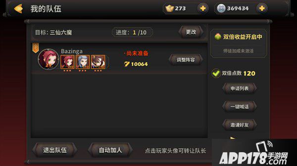 开启条件:三人组队开启。注意一定要点双倍点数,开启双倍收益。(双倍点数每周六更新180点,每次三仙六魔任务消耗2点。)