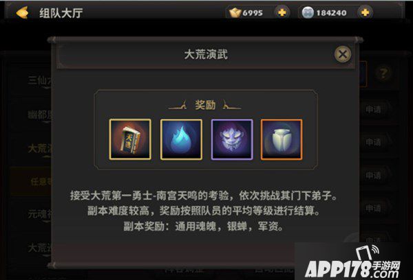 大荒演武共分8个环节,需要3名玩家组队开启。副本奖励天选者经验、银蝉、通用魂魄、军资。