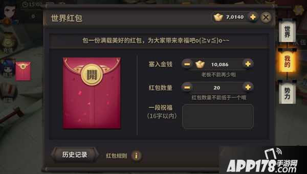 红包一抖,金币到手!新版本上线之后,玩家可以将游戏内的虚拟道具,比如金币,制作成红包,然后发放到势力内部或者聊天频道,其他玩家可以拆开红包,领取相应的道具。快去告诉你的壕伙伴吧~