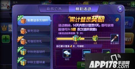 这个活动就累计登陆奖励,在活动期间,十四天内累计登录9天,即可获得超值可升S级的永久球杆的奖励,而且登陆的过程当中,还有很多的道具和砖石赠送,各位玩家还在犹豫什么,赶紧来游戏里面一展身手吧。