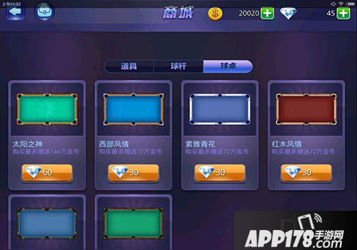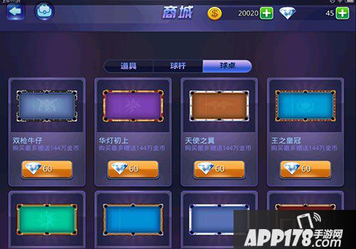 进入到商城,我们可以看到有三种类型的物品,道具、球杆和球桌,购买球桌不仅能获得球桌,还可以赠送金币哦,钻石充足的小伙伴还在等什么呢。