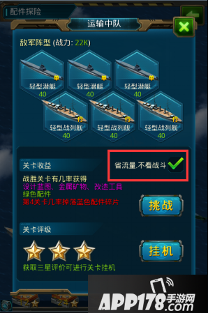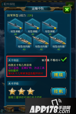 配件探险中有额外的副本奖励。每个关卡结算时,根据玩家损兵程度判断可获得的星星数量:损兵低于10%,即可获得三星评价。