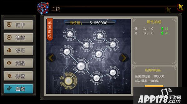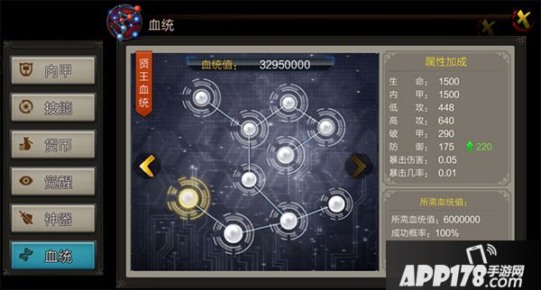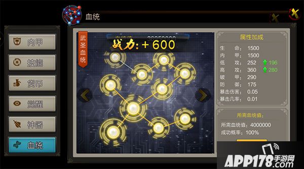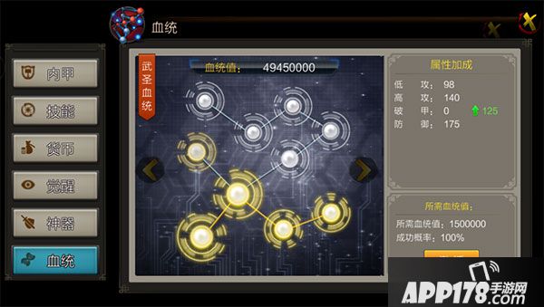 先点击游戏主界面右边的黄色头像,会弹出菜单栏,再点击菜单栏中的“血统”,即可查看血统的具体详情哦!进入血统页面,初始为武圣血统,消耗血统值来升级,点亮星图。