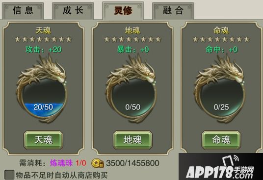 2、玩家每次灵修时,可选择炼制哪种魂魄。只需点击该魂魄下方的灵修按钮即可对该魂魄灵修。