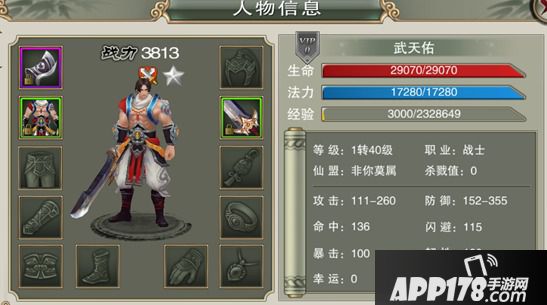 在人物界面里,玩家可以查看角色的装备、战力、属性、等级、所属仙盟等信息,还可以从正面欣赏角色的造型。