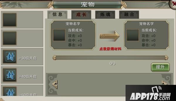 1、消耗道具成长丹可提升宠物成长经验值,经验值达到100时,成长等级提升一个等级。提升成长等级,可增加宠物的攻击、命中以及暴击。