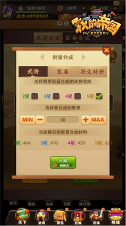 上面说到37《我的帝国》的好友系统可以查看好友的排兵姿势,那么有朋友要问了,光是排兵不够,如果想要提升武将实力,该怎么做呢?这时你可以选择合成系统。合成系统可以将5个同等级的武将或装备随机合成为1个高一等级的武将或装备。合成会消耗一定的铜币,点击批量合成可以快速地合成武将、装备和符文材料。当主公等级达到90级时可以进行材料的分解。