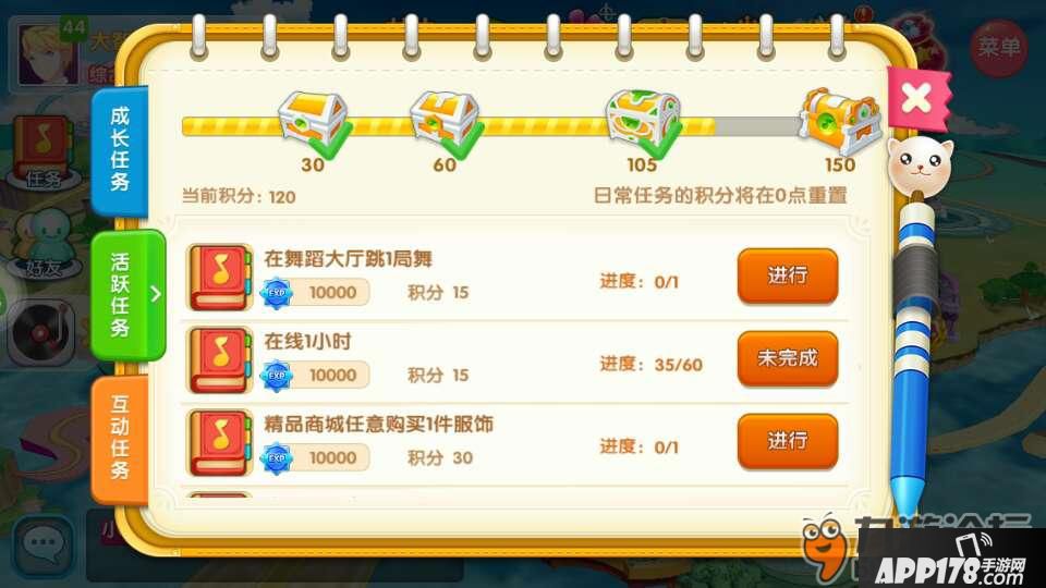 嘻嘻~每日活跃任务很好做的。跳舞房跳一次→动作卡使用一次→在线一小时→等等,跟着系统的提示做就行,简简单单100红钻到手! 【故事】