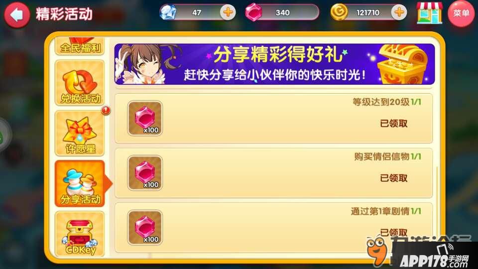 还可以过故事呐,每一章故事如果你达到满星都会150红钻,还有60的体力小瓶子呢,每章都能赚取红钻哦! 【分享活动】