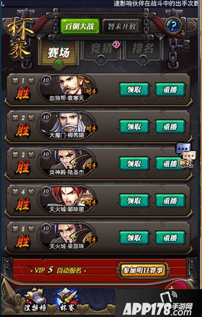 四方云动强者云集,各路高手齐聚百朝大战!大炎王朝各路豪杰将在皇城选拔,争取百朝大战的参赛资格。游戏中,玩家可在每天8点到24点报名参加次日的比赛,每日报名都可重新设定阵容,确保玩家以最强或是最有针对性的阵容来迎战对手。8强之前的战斗由系统自动进行,玩家可观看重播,确定成绩并寻找差距。决出8强玩家后,选手将身负王者荣耀横扫群雄,不仅获得更高涅槃境界,更有至高奖励纯元宝箱收入囊中,再经过淘汰赛、半决赛、决赛多回合战斗争夺最终的百朝大战冠军,傲视群雄。