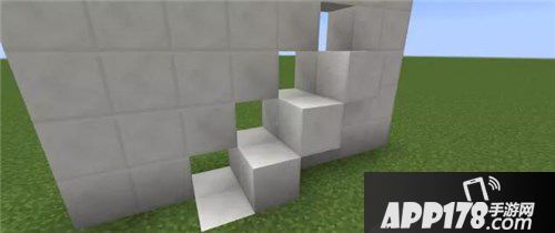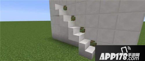 准备好石英块、石英楼梯、粘性活塞、红石中继器、红石粉和拉杆这6件道具后,我们就可以开工了,首先搭一面墙壁,然后在墙上把楼梯所处位置的方块清除~