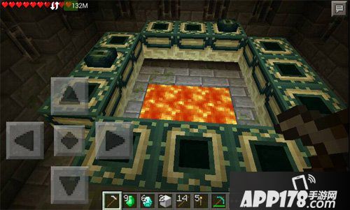 5、很快你就会掉入一个地牢,中间有一个充满岩浆的台子,台子上面有几个绿蓝相间的方块