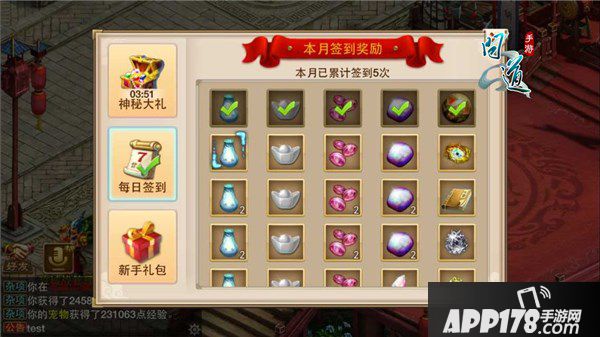 转到的大奖还不满意吗?《问道》手游还有每日签到福利,玩家每日登陆游戏后,到福利页面签到即可获得精选道具。如下图。