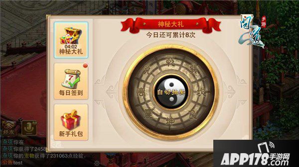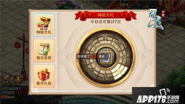 点开福利界面后,首先看到的是“神秘大礼”,当玩家累计在线时长到一定时间后,就可以领取神秘大礼啦,每位玩家每天都有八次领取神秘大礼的机会,道行、经验、元宝、潜能等,任你来挑。