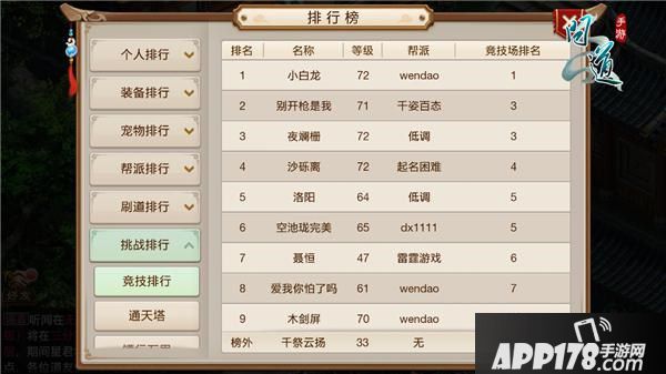 当有一方的队员全部阵亡则该方失败,而如果战斗的回合数超过50回合,则系统会强制将该场结束,根据角色道行高低判定胜负,角色道行高的一方判定为胜利~在挑战胜利后,将得到经验、金币和声望奖励,并且获得被挑战方的排名(排行榜见下图)。