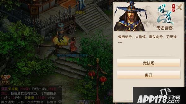 找天墉城的无名剑客对话(见下图),即可参与竞技场活动,打开活动列表,点击参与可自动寻路到无名剑客处。竞技场活动全天开放,但每天只能挑战5次,每天凌晨5:00会重置挑战次数,每次挑战胜利将获得大量经验、金币及声望奖励,如果挑战失败的话,那么奖励将会减半。