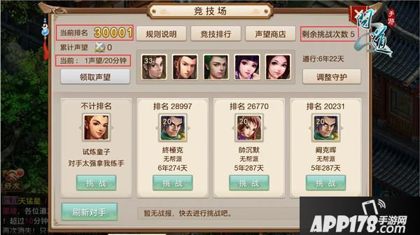 与NPC对话弹出竞竞技场界面(下图),界面上可以进行查看规则说明、竞技场排行、打开声望商店、挑战对手、刷新对手等等操作,也可以查看排名,声望获得速度,剩余挑战次数等信息~