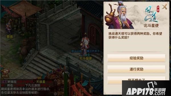 找天墉城的“北斗星使”对话,领取任务即可进入通天塔,打开活动列表点击通天塔活动里的“前往”按钮也可自动寻路至NPC处。与北斗星君对话,经过北斗星君的一番教育后,会让您选择经验奖励或者道行奖励,选择后即可进入通天塔。
