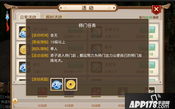 大家可以看到活动说明,为自己的师门发扬光大哦!!ps:说明一下师门任务单人完成哦,不过可以带守护的!