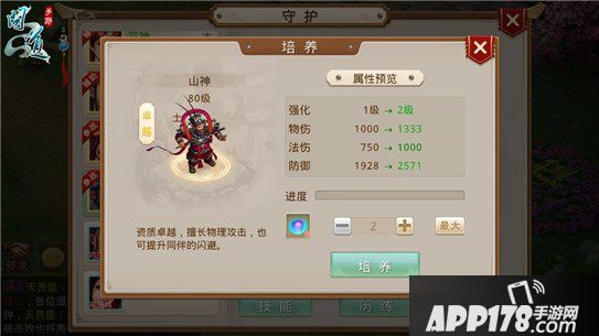 其次是培养,道友们用元气丹来培养守护,守护培养可以激发潜能,使守护得到强化,大大增加了守护的物伤、法伤和防御。每一次培养需要投入2-6个元气丹,元气丹可在帮派商店和竞技场商店进行购买。元气丹投入数量越多培养成功率越高,若培养失败也会累加培养完成度。