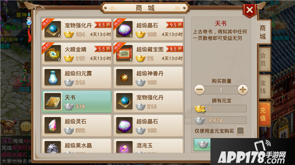 宠物天书获得天书我们只能在商场中用元宝来购买,每一本天书可以开出两个技能。但是这两个技能是随机的,所以想要获得你想要的天书还是需要花费一定的元宝的。