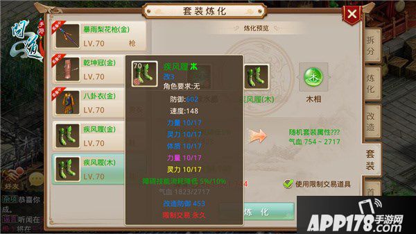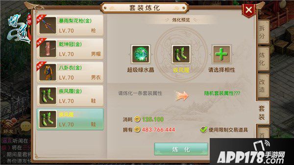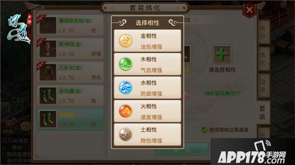 首先道友们需要准备好金色装备(装备等级≥70级)和超级绿水晶。然后点击主界面右下角的“打造”-“套装”,打开套装炼化界面。其次选择要炼化的装备,和准备炼化的装备相性(金、木、水、火、土);点击“炼化”按钮,则炼化成功,金色装备便成为带有相性的绿色装备啦。如果仙友对炼化的属性值不满意,还可以继续使用超级绿水晶进行重复炼化。