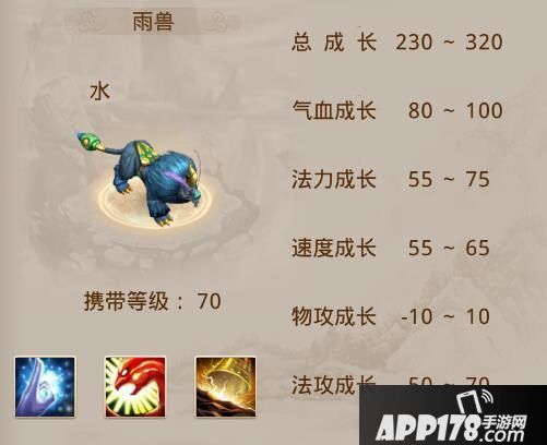 血量95、速度70、法攻80,手游目前普通宠物里面法攻成长最高的宠物,且速度不凡,还带有可免除物理伤害的天生技能神龙罩,着实是很突出呀。