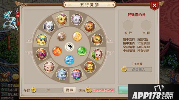 在游戏中,玩家可以直接去天墉城中的五行竞猜参与这项玩法,使用游戏币就能自由的下注竞猜五行还有生肖了,如果是玩家自己猜中了五行的话,可以很容易的获得五倍的游戏币奖励了,如果是自己猜中的生肖的话,就可以获得12倍数的游戏币奖励,如果玩家自己的运气好点的话,就可以获得六十倍的奖励,奖励是很丰厚的。下面小编就为大家带来问道手游五行竞猜玩法竞猜技巧分享!