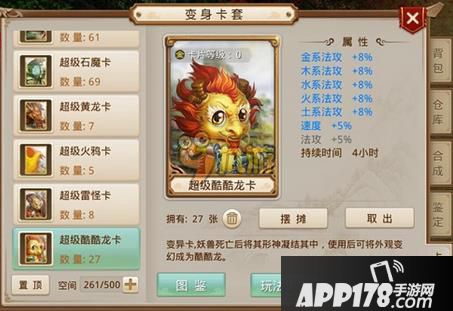 3、变身卡说明:变身卡为消耗道具,玩家可以使用变身卡在一定时间内获得增益效果(气血、防御、法力、物攻、速度)和变身效果。