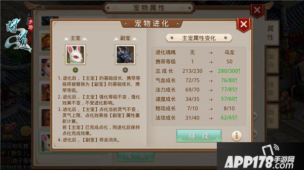 宠物进化涉及到主宠和副宠,主宠是指接受成长的宠物,进化后主宠的基础成长将会替换为副宠的基础成长,主宠不会消失。副宠是指提供成长的宠物,进化后副宠会消失。进化成功后,副宠将会变成主宠的魂魄,魂魄(副宠)决定了当前宠物的基础成长,比如主宠为兔子,副宠为乌龙,则进化成功后,主宠兔子的魂魄即为乌龙,主宠兔子的基础成长将被副宠乌龙代替。若宠物未进化过,则进化魂魄为无。若副宠也有魂魄,则副宠的魂魄将变成主宠的魂魄。