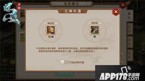 想开启“元神共通”功能,道友们需要两只宠物,一只参战宠和一只掠阵宠,在掠阵宠物的界面点击“成长”按钮中的“元神共通”选项即可开启“元神共通”功能。