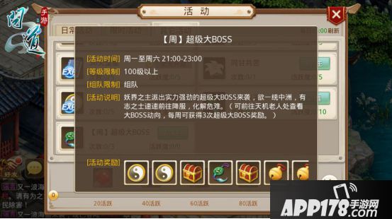 每周一到周六的21:00,所有服务器的4线将会在各个地图刷新世界BOSS,21:00-23:00的2个小时里,所有等级在100级以上的玩家都可以参与世界BOSS的挑战。需要注意的是,每名玩家每周最多可以获得3次世界BOSS的奖励,次数将在每周一5:00重置。玩家在天墉城的NPC天机老人处可以查询BOSS刷新的位置与当前可挑战BOSS次数。