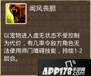闻风丧胆 :只能对敌对玩家使用,使用后宠物变为虚无状态无法控制,令对手无法使用师门障碍技能,技能提升到160级时持续2回合(翻盘神技)