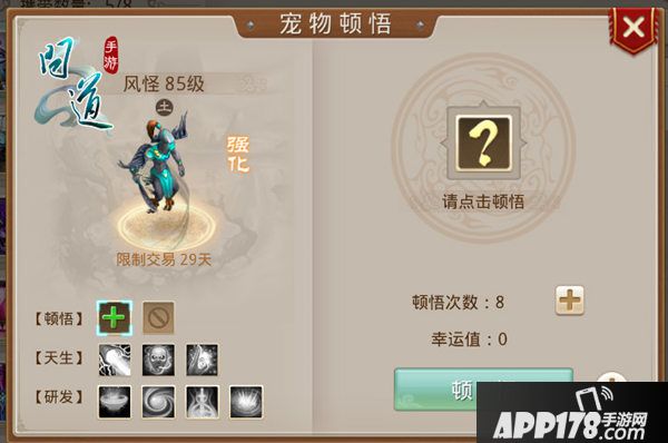 顿悟使用后,随机顿悟出一个天生技能或者一个进阶技能。