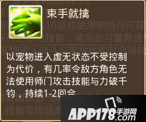 束手就擒 :只能对敌对玩家使用,使用后宠物变为虚无状态无法控制,令对手无法使用师门攻击技能以及力破千钧,技能提升到160级时持续2回合;